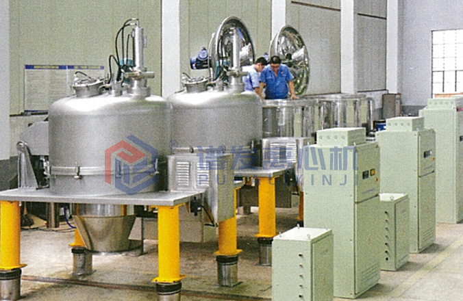 Material to be separated enters into the basket of the centrifuge that is rotating at high speed through a feeding pipe, and under action of the centrifugal field, the material passes through the filter cloth (screen) for filtration. Then the liquid phase discharges through the discharge pipeline, while the solid phase is retained in the basket. Feeding stops once the basket is filled with the material, then wash the solid cake, and discharge the washing liquid through filtration. The centrifuge continues to rotate to spin - dry the solid cake. After the solid cake meets the requirements for separation, the centrifuge reduces its speed, and removes the cake by means of the scraper, then discharges the cake out of the centrifuge. The centrifuge further reduces its speed So that the pneumatic pulling bag device moves reciprocally to shake off the residual solid cake, thus completely eliminating the solid cake.