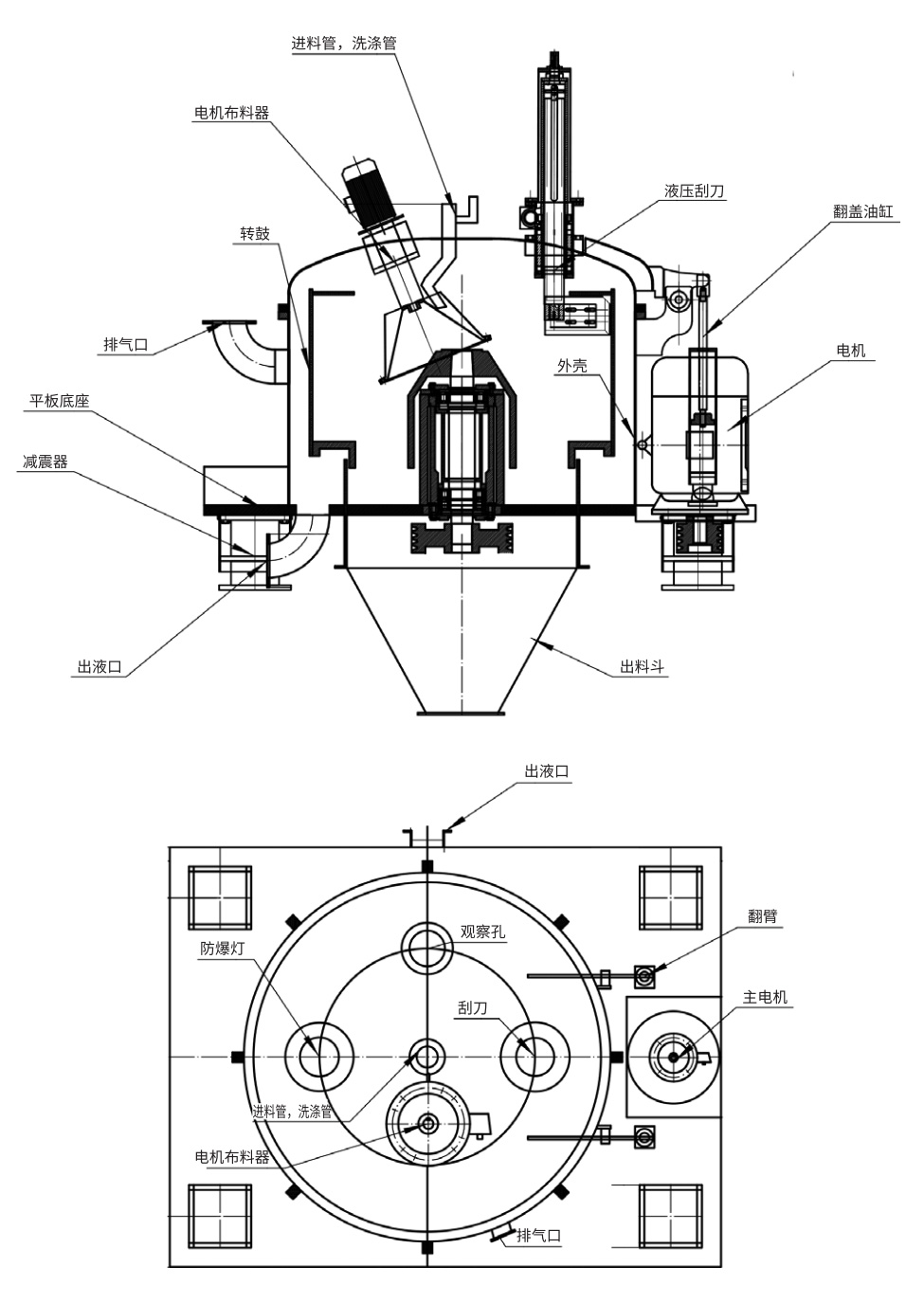 The automatic bottom discharge scraper centrifuge is vertical fully - automatic filtration centrifuge. The motor drives the basket to rotate at high speed through the belt, and under the control of pre - written program, the material to be separated is fed into the basket through the feed system. After the material is filtered through the filtration medium (filter cloth/screen) under the action of centrifugal force, the liquid phase discharges out of the centrifuge through the liquid pipeline, and the solid phase is retained in the basket. A material detection device is used to detected material flling position in real-time manner, and when the solid cake deposited in the basket reaches the specitfied holding capacity of the centrifuge, feeding stops. Then wash and dry the solid cake. After the solid cake meets requirements for knock-out, the centrifuge reduces to the scraping rate, under the hydraulic (pneumatic) control, the scraper device removes the solid cake, and then the cake is discharged at bottom outlet of the centrifuge.
